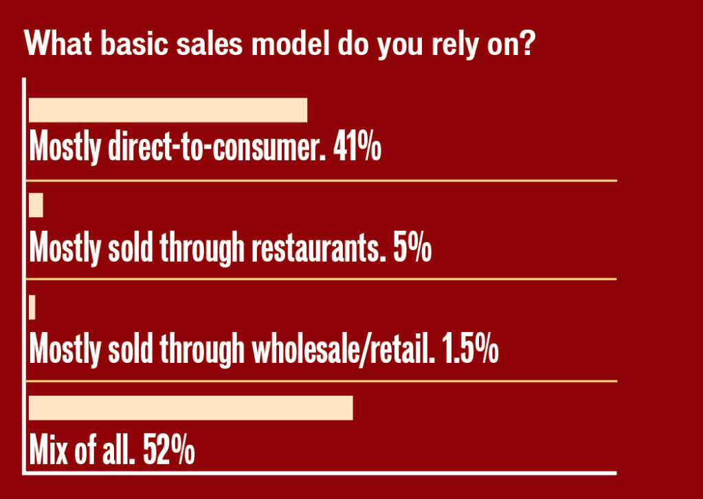 Many rely primarily on the direct-to-consumer, or DTC, formula, in which business flows through the tasting room and wine club. Some are more invested in selling wholesale to bottle shops and grocery stores (also known as the “off-premise” market), and others focus predominantly on restaurant, or “on-premise,” sales. Most, however, depend on some combination of all three.