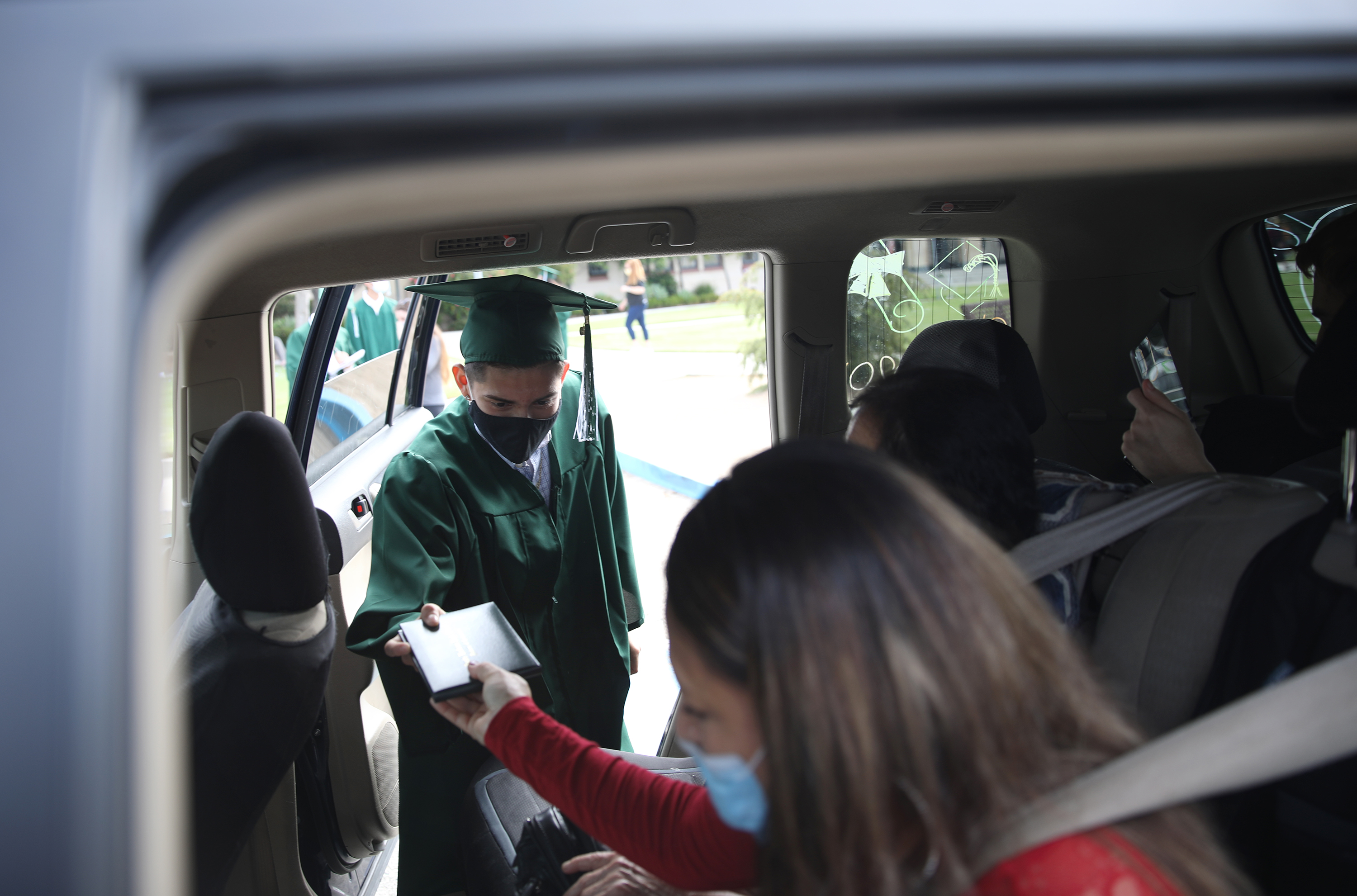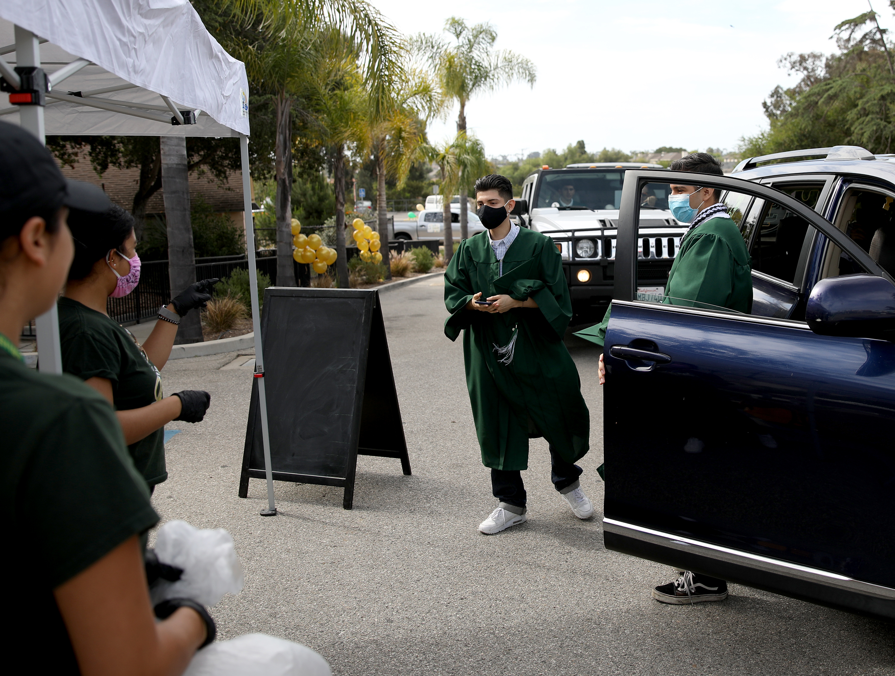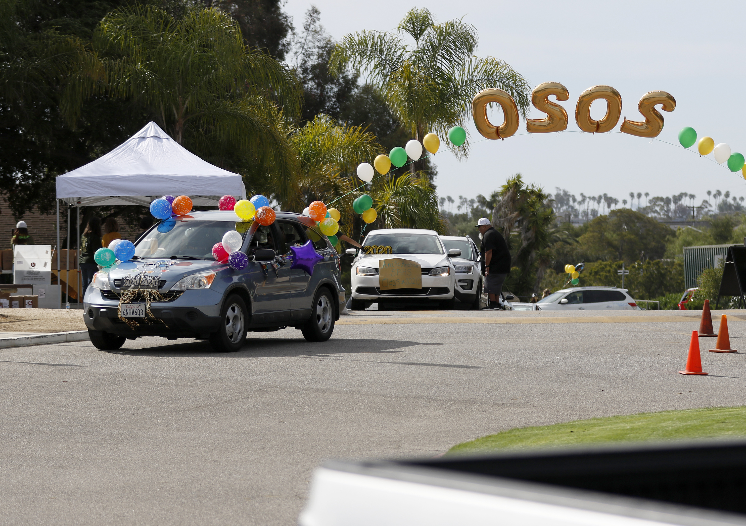 Barrientos rode in the car with his family through a balloon archway with “2020” at the top before getting out and walking to grab his “senior bundle” bag, which contained his diploma and momentos. Then he took a quick photo with Simmons, who stood six feet away, and got back into his family’s car to ride away.