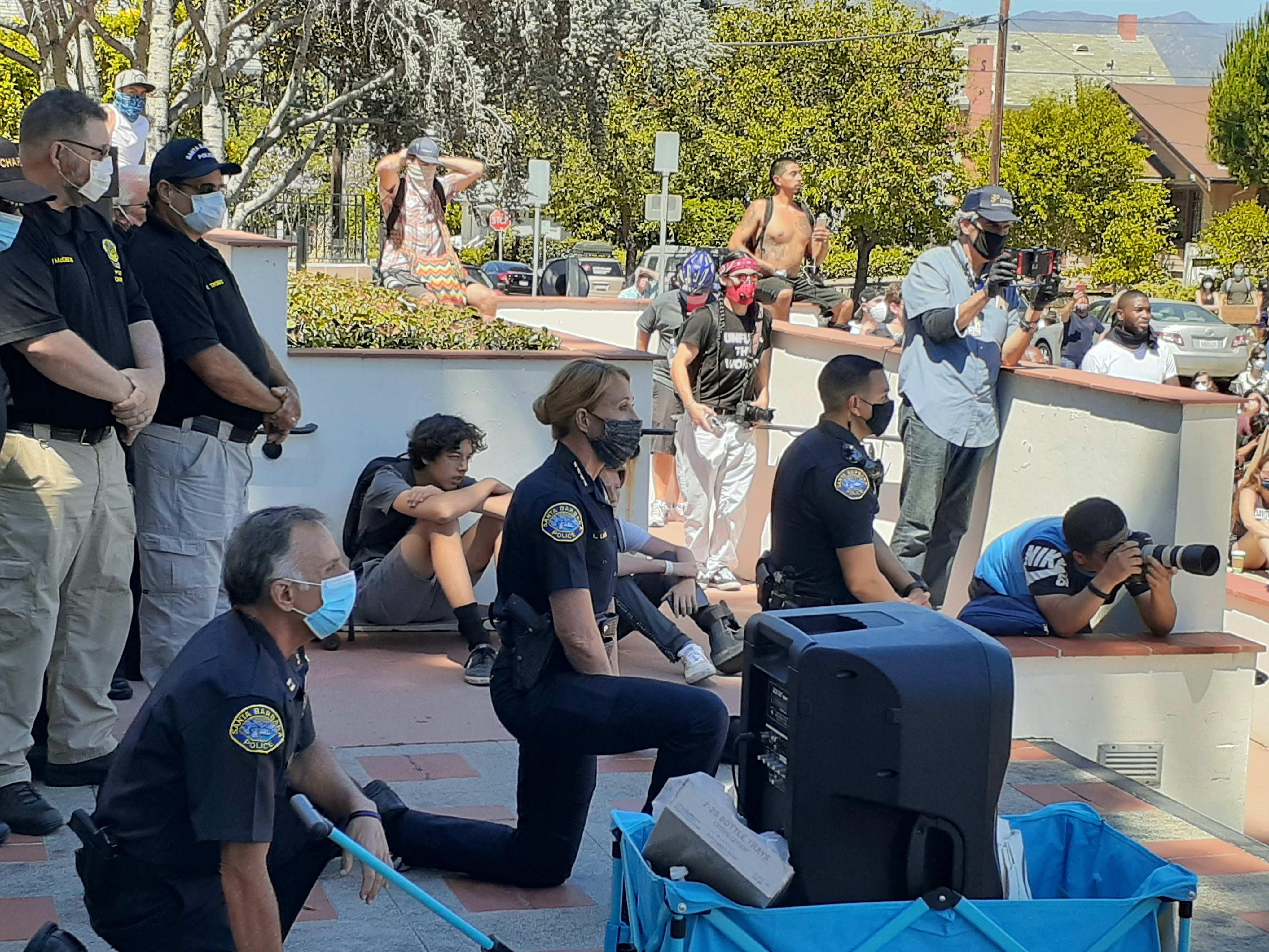 The shields, batons, and intimidating human police barricade were gone. The police chief herself, Lori Luhnow, was present this time and listened to the same demands Black Lives Matter S.B. delivered last week — only this time, she and the handful of sworn officers on either side of her took a knee. Mayor Cathy Murillo, who at the protest one week ago did not kneel, also took a knee in solidarity with the protesters on the sidewalk nearest to Santa Barbara Street in front of the police station.