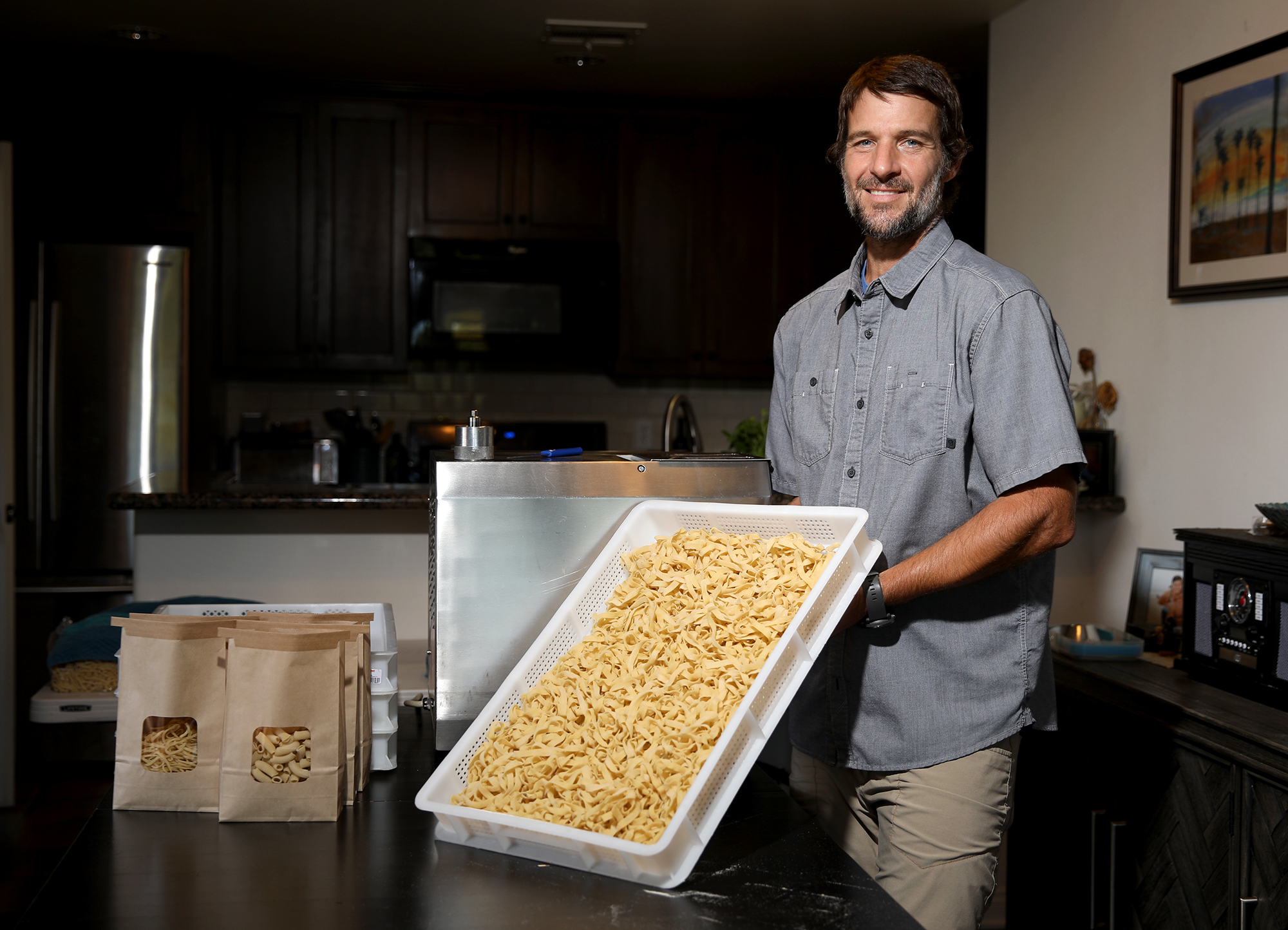 In 2010, after taking a year off to watch his newborn son, Luca, Glazer started making pasta again at a commercial kitchen on East Yanonali Street — much of it went to Los Angeles caterers — while also serving lunch and dinner. That was the official birthplace of Mission Rose Pasta, but he moved to the Goodland Kitchen in Goleta in February 2018. Pasta was the core of his weekend dinners there, too, in part for economic reasons. “I never knew what was going to happen at dinner,” he said. “Maybe there’d be two people, maybe there’d be 20, but it was easy enough to make pasta.”