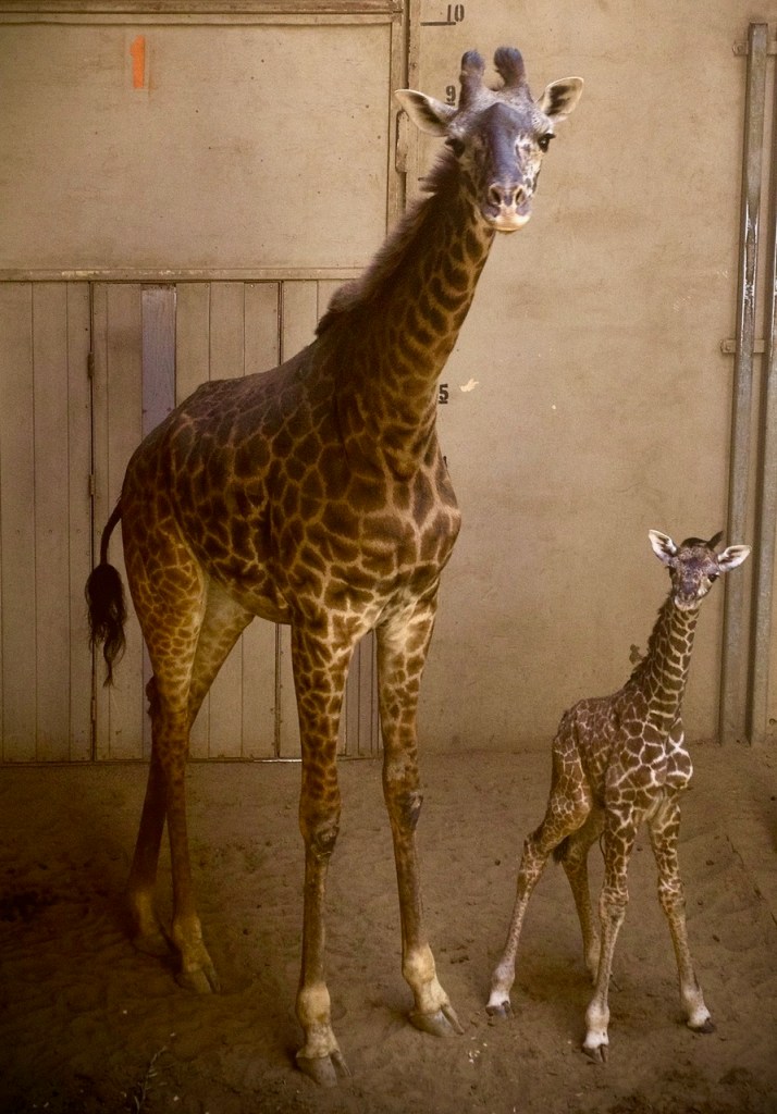Masai giraffe Adia gave birth to her first calf, named Twiga, a male measuring 6 feet tall and weighing in at 125.5 pounds.