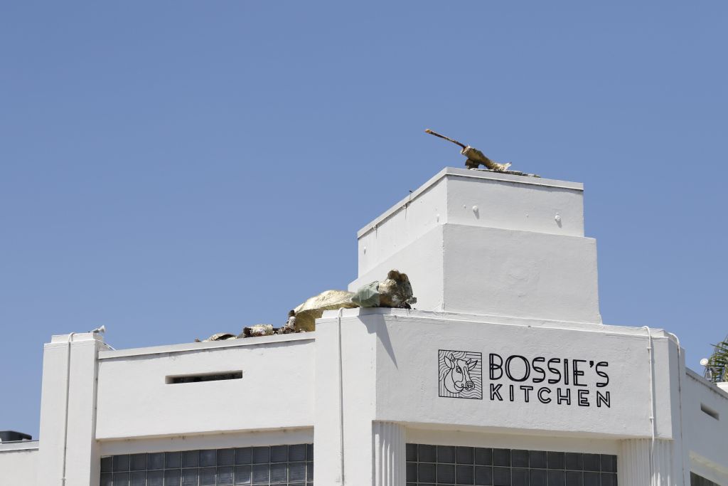 [Update: Aug. 7, 1:40 p.m.] Santa Barbara High School teacher Brandon Teris wrote that he’d been last up on the restaurant roof in May to paint the names of graduating seniors on Bossy. He doubted anyone “tipped” the statue and thought it more likely due to natural causes. “The front leg was crippled,” Teris said. “Imagine all the weight from the DECADES of paint on a structure that was simply made of plaster. I believe that it ‘fell over’ due to the weight, & recent winds could be a contributing factor.”