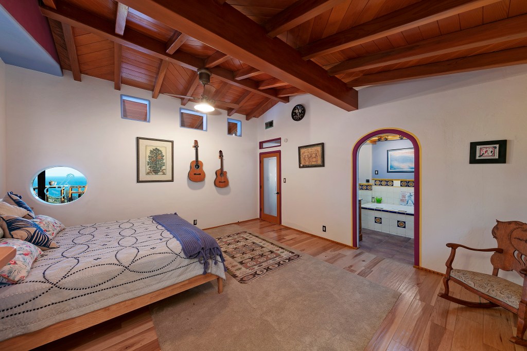 Throughout the Spanish-style house, artistic touches reinforce the bohemian vibe, including arched doorways, colorfully tiled bathrooms, and gorgeous natural woodwork. High cathedral ceilings, skylights, and hardwood floors keep the airy, natural ambience flowing.