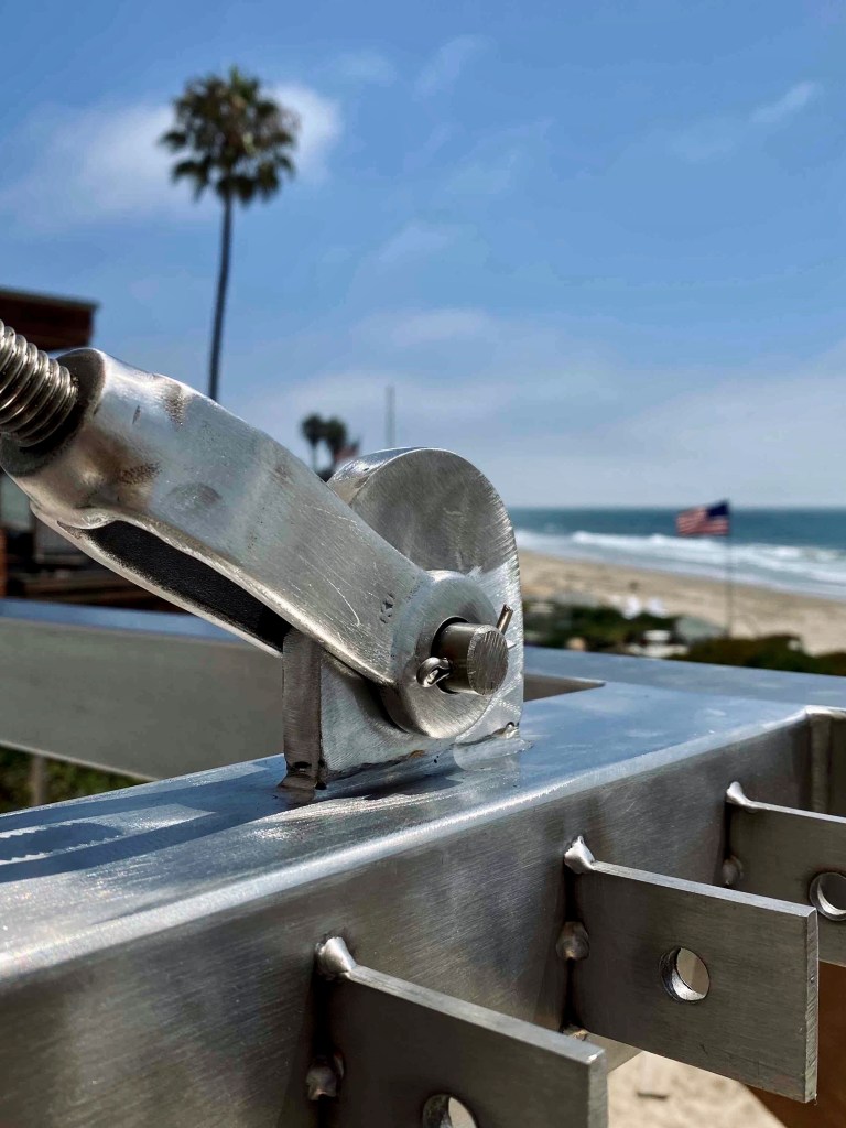 Details of the custom stainless steel hardware fabricated to support an awning structure. | Credit: Jake Lewis