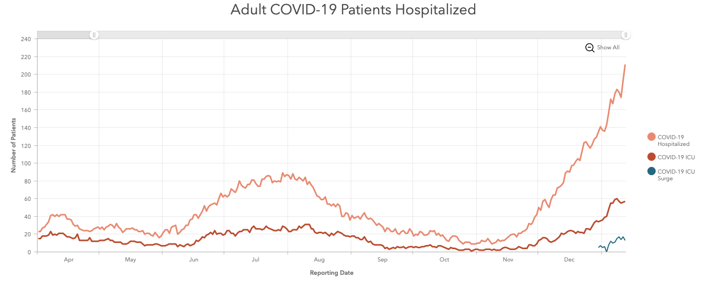 The death count surpassed 200, reaching 207 on Tuesday. That’s a more than 50 percent increase since November 1. Hospitalizations and ICU admissions are at new record levels as well, with 211 and 57 patients, respectively, now receiving emergency care.
