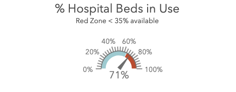 Of the county’s 598 hospital beds, 427 (or 71 percent) are currently in use by both COVID and non-COVID patients. The Health Department’s high-alert Red Zone was breached at 65 percent. Of the 89 staffed adult ICU beds, 80 (or 90 percent) are occupied. That Red Zone was broken at 80 percent.