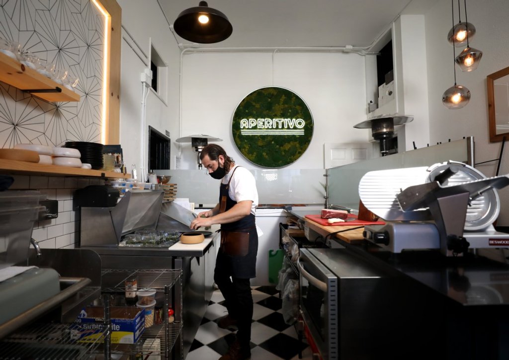 They took over the property’s lease in March, and then were furloughed due to the pandemic, giving them ample time to focus on the design of Aperitivo, which is small in size but glitters with light and energy inside. The original concept, which they look forward to returning to once the pandemic subsides, emulates Italy’s aperitivo bar, a popular place for quick sips, small bites, and conversation with friends between work and dinner. (And I look forward to writing about that side of the business when I can.)