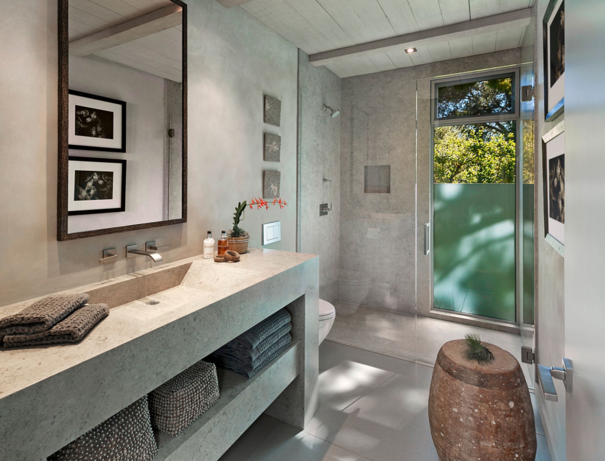 Maintaining the original footprint at approximately 3,000 square feet, the Siemons opened up parts of the interior, brought in more natural light through five new skylights, replaced about half of the redwood walls with a smooth coat of plaster, and finished it to match the grayed patina of weathered driftwood. Most of the removed redwood planking was repurposed as baseboard and cabinetry. Underfoot, composite concrete floors complement the new walls, windows, and doors.