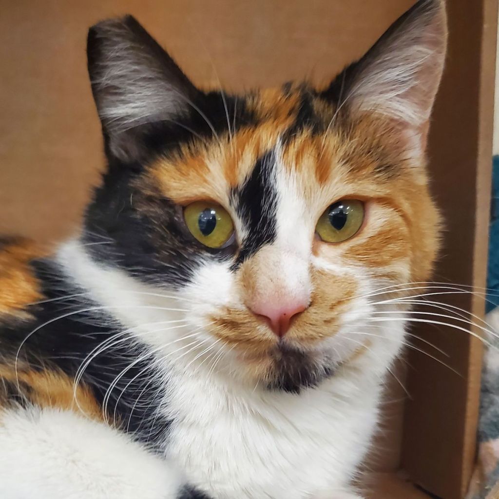 Lanie is a five-year-old female calico cat. She’s shy and needs a little extra time to adjust to a new home, but once you’ve earned her trust she is a real love bug. If you’re patient you’ll soon be rewarded with happy kneading. Lanie is looking for a quiet home that she can fill with purrs.