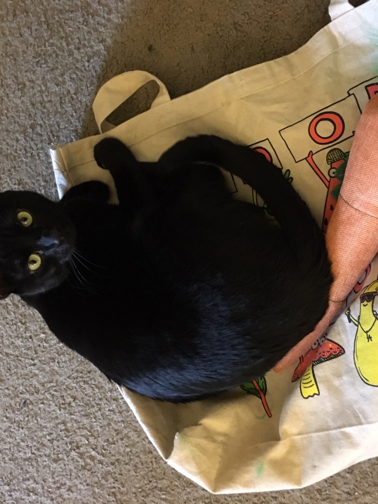 He chirps like a bird, teleports across the apartment with his black cat magic, and “helps” us unpack our groceries from the S.B. farmers’ market (see photo!).