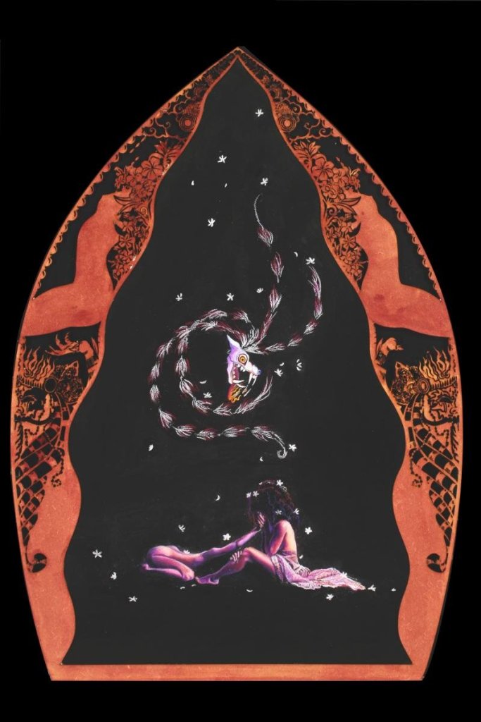 Imagery varies greatly in the show, from Rachel Elliott’s mystical, hermetic oil portraits of endangered species to Charlotte Westburg’s Prismacolor odes to everyday tools. Valerie Angulo’s “And Then It Was Good” offers a metaphorical tableau in seven panels dealing with her trauma following a rape in Bali.