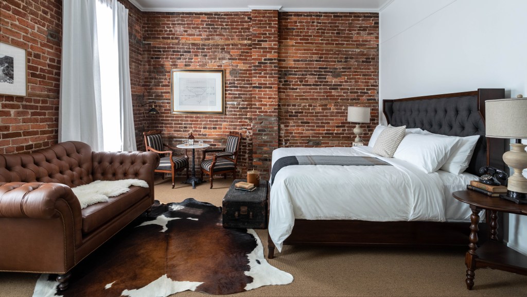 The 28-room, three-level hotel retains its historic integrity down to the original brick and stone walls. Local architects and craftspeople were brought in to help preserve and enhance period elements like the woodwork and stained glass behind the bar at the 1852 Golden Gate Saloon — one of the longest operating bars west of the Mississippi. Villanueva and her design team scoured local sales for the authentic vintage prints, taxidermy, and pianos you can see in public spaces and guestrooms.