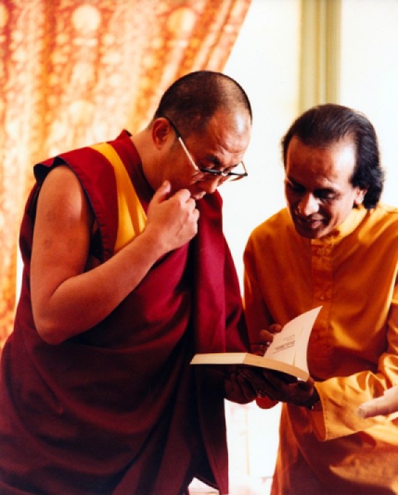 However, it appears that some clarification is needed. The photograph on the printed cover (the same photo that appears under “A Lifelong Friendship” in the online version) is not Pico Iyer and Tenzin Gyatso meeting in 1986. It is Pico’s father, Professor Raghavan Iyer, meeting the 14th Dalai Lama in 1984.