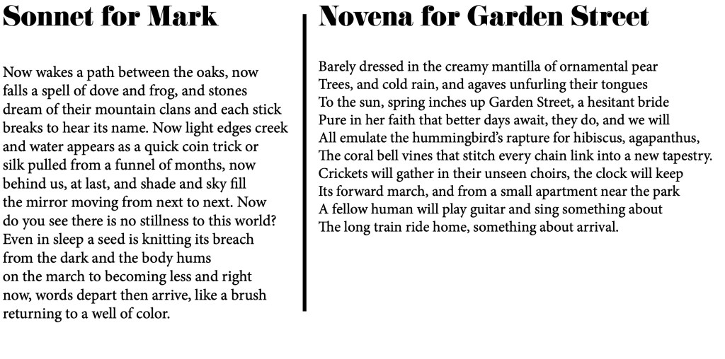 What follows are two poems that represent the kind of work that Trelles has been doing since moving to Santa Barbara seven years ago. “Novena for Garden Street” and “Sonnet for Mark” have both been published as part of the anthology While You Wait: A Collection by Santa Barbara County Poets, which was edited by Poet Laureate Emeritus Laure-Anne Bosselaar and is available both online and in print from Gunpowder Press.