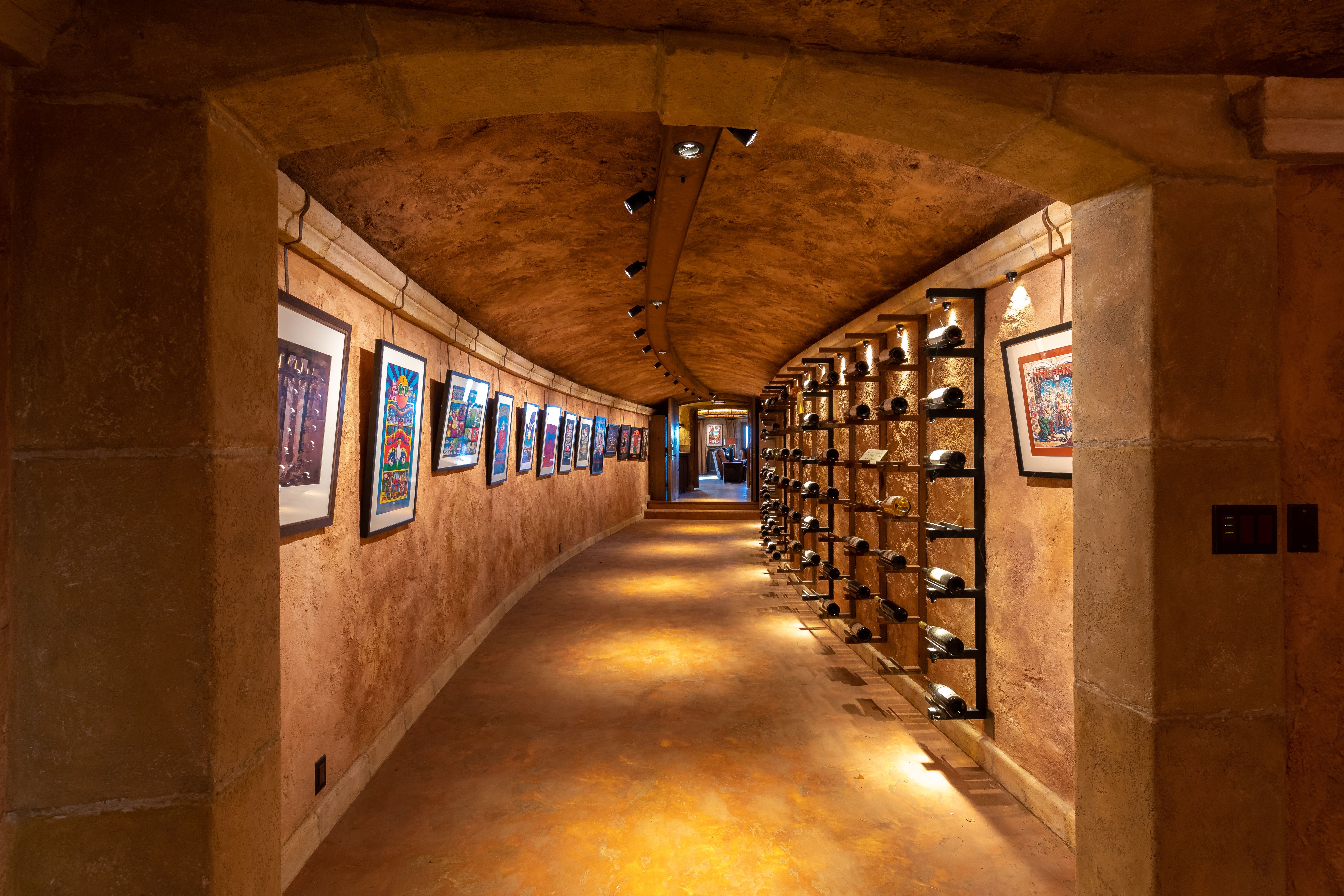 Reminiscent of a magical fairy-tale entryway, a curved wooden door — surrounded by river rocks and built into the hillside — opens to reveal the wine cave. A long hallway invites visitors to meander and ogle the wines displayed along its right-hand side, each rack individually spotlighted by dramatic lighting. Equally hypnotizing — to me, at least — was the artwork showcased on the opposite side of the hallway: a collection of originals by artist Rick Griffin.