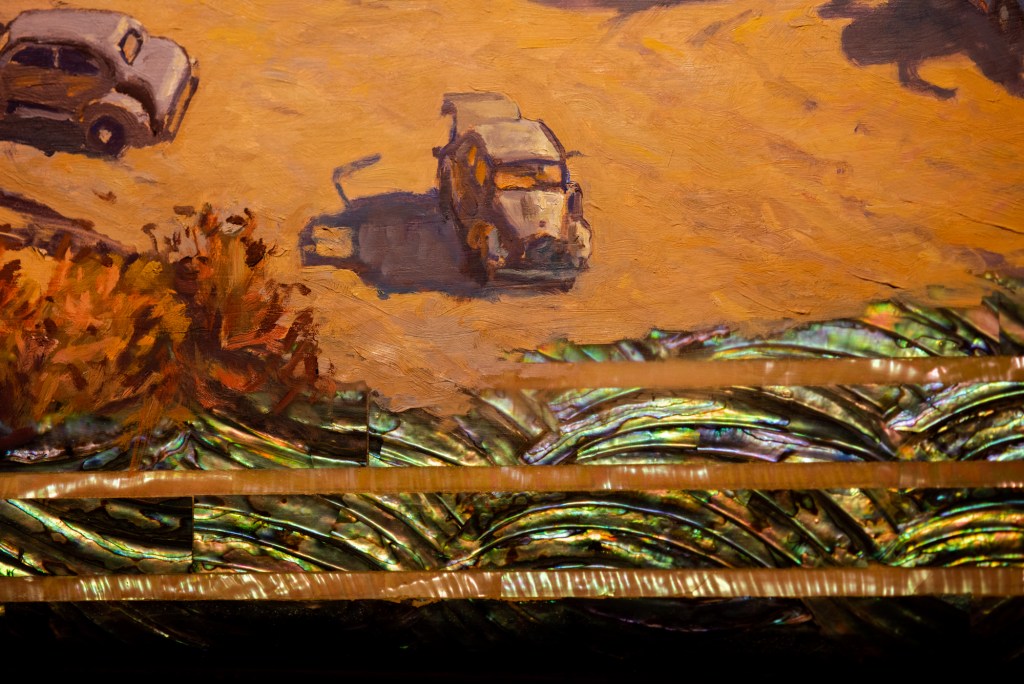 The first three created offered quite an introduction to the eventual eight-board collection: an early 1930s Tom Blake paddleboard with faux redwood and metal rails and a vignette oil on gesso painting of Palos Verdes Cove; a 10′6″ Pacific System Homes faux balsa board with abalone inlays from the early 1930s with a painting of the lineup at San Onofre; and an early 1950s Hobie Balsa Board with Dana Point on the deck. They generated immediate buzz, the trio’s combined skills proving almost too good to be believed.