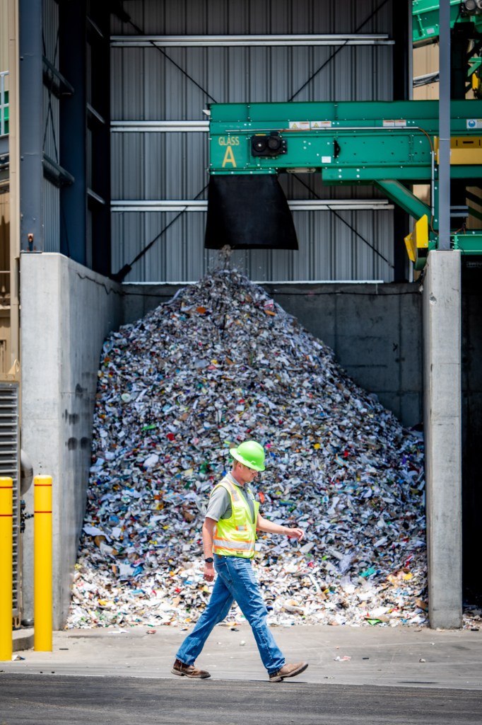 The ReSource Center employs 20 people to stand watch and pull out strays along the pathways to ensure the recycling bales are clean and marketable. Giant silver air ducts siphon the upper reaches of the building into two large filtering tanks full of dampened wood to create a negative-pressure space; the system maintains air quality for the workers and helps eliminate odors from a building full of garbage.