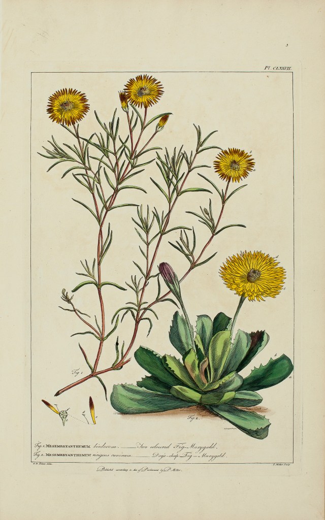 The exhibit’s title, A Medicine to the Mind, was inspired by scenes like that of the Chelsea Physic Garden in London, which was established by the Worshipful Society of Apothecaries in 1673 to grow plants that could be used as medicine. A drawing of its extensive grounds occupies much of the wall facing the exhibit entrance. Plants as a source of healing, comfort, and joy provide a common thread in the exhibition. Miller said that in a year poisoned by a global pandemic and other traumatic events, the interest in gardening and growing things has blossomed, and like the coming of day after night, a garden’s cyclical replenishment offers the promise of a brighter future.