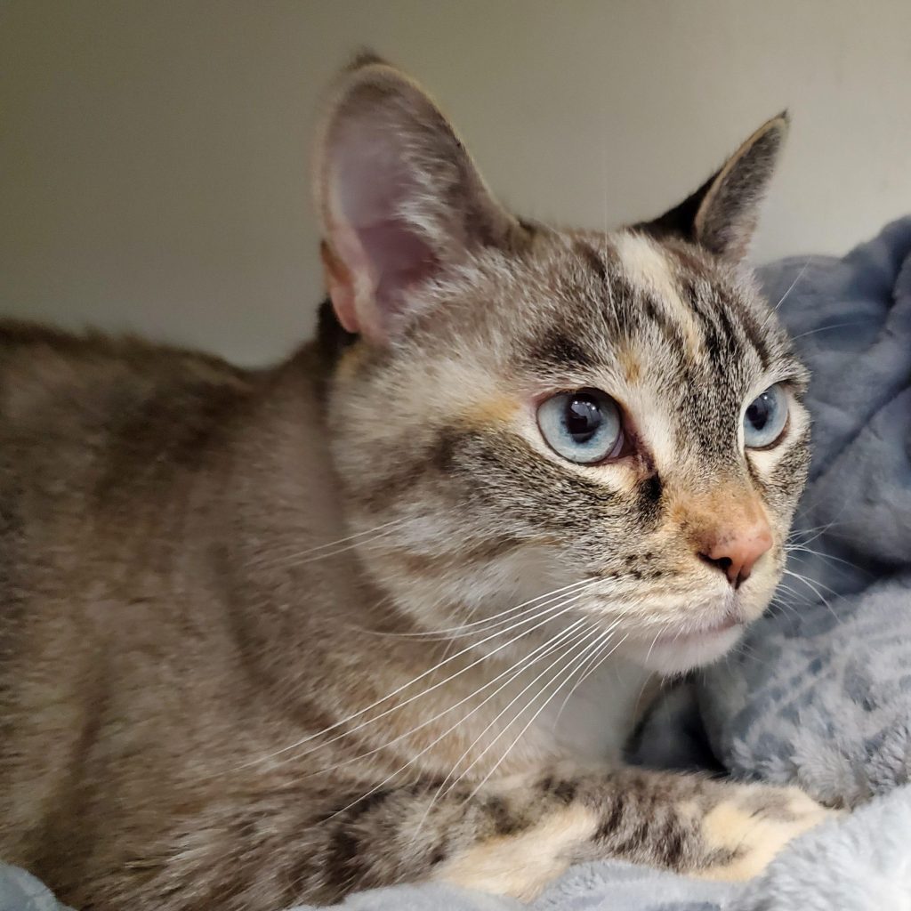 Bear is an eight-year-old tortie/lynx point mix female cat. After her coming to the shelter she became depressed and wanted to be left alone. Now that she’s had time to mourn she has begun showing her sweet personality. She loves to snuggle and pets will be rewarded with cat drool. Her favorite toys are ankle socks and she likes to carry them around the house.