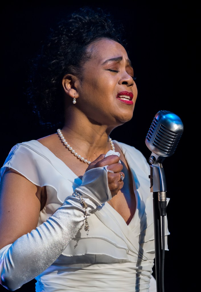 Lady Day at Emerson’s isn’t a musical; it’s a play with music, and it includes more than a dozen songs and an equal number of revealing Holiday monologues. It has been widely produced since it premiered in the mid-’80s, when playwright Lanie Robertson got the idea to present the singer’s life through the lens of one shambolic late-career performance. The location, Emerson’s Bar and Grill, is a small, run-down joint in Philadelphia, a city for which Holiday had a strong and understandable dislike. The time is 1959, just a few months before the singer’s death, and she’s in rough shape, both physically and emotionally. In between songs, Holiday banters with her pianist, Jimmy Powers (here played by the excellent Stephan Terry, who is also the show’s music director), and spills her guts to the audience. Apparently unable or unwilling to let go of a long list of grievances, Holiday rages and reminisces, expressing a wide range of mostly negative emotions, from anger at the undercover cops who hounded her out of being able to perform in New York City to disappointment with her mother, the “Duchess,” who struggled with her own demons and let Holiday down more than once.