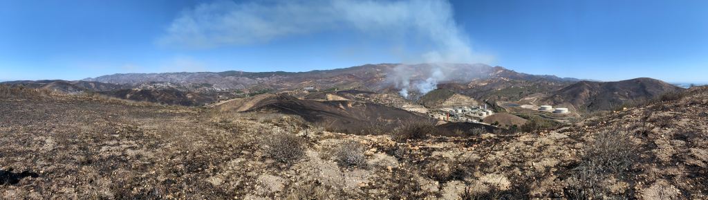 With the prevailing winds taking a break the last couple of days, firefighting crews — now 1,747 people are engaged in the effort — have been able to considerably slow down the fire’s rate of spread. It helped matters considerably that the fire encroached on the scene of two relatively recent fires to both the east and the west. Although revegetation has occurred in these scarred out areas, the fuel load has been considerably less.
