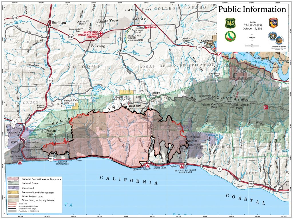 The campgrounds at the state beaches nearby are closed until October 24 — Gaviota, Refugio, and El Capitán — as the firefighters are using them for housing, access, and staging. Fire trucks are frequently on Highway 101, and motorists are asked to be careful as they drive through Gaviota.