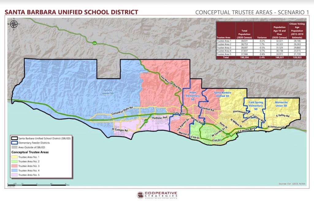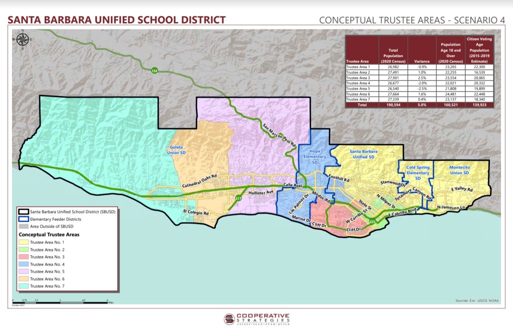 Santa Barbara Unified School District has begun the process of transitioning from at-large elections to trustee area elections, now with four possible maps of district boundaries, following the board’s decision to transition in 2018 as a response to the California Voting Rights Act of 2001.