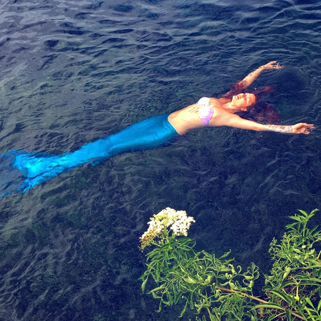 Three-quarters of a century later, the mermaid magic still happens in Weeki Wachee, though the roadside attraction is now a state park with water slides and kayaking. There is a new generation of mermaids now, but the legendary sirens of the deep (mermaid alumni) teach a mermaid “boot” camp at the Weeki Wachee amphitheater. I attended this mermaid school in 2019, and a woman in her eighties, a Weeki Wachee mermaid from the 1950s (she performed for Elvis Presley in her heyday and is still an extraordinary swimmer) taught me to swim in the mermaid tail. I learned some basic underwater acrobatics and how to look natural while posing underwater. No part of this was an easy task, but a sense of calm in underwater endeavors makes the mermaid experience transcendent. (And there’s something rather energizing about knowing you have the power to lure sailors to their death, should you choose. Though in Weeki Wachee, where the mermaids are friendly, the interactions with landlubbers involved more flicking the tail fin at enchanted children than drowning unlucky seafarers.)