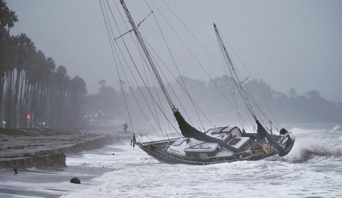 The rain along Gaviota was described as “super gentle, through and through” by Guner Tautrim of the Orella Ranch, who noted they got about two inches along the coast and more than five inches at the top of the ridge at Refugio. A few landslides dropped mud and rock on the road, and high winds sent a sailboat into the beach in Santa Barbara. But very little damage was reported by both fire and law enforcement officials, apparently caused by the wind: a downed wire off Foothill Road, broken tree branches, trees that damaged a structure and vehicle in the city. The day after, however, has been one of sporadic power outages downtown.