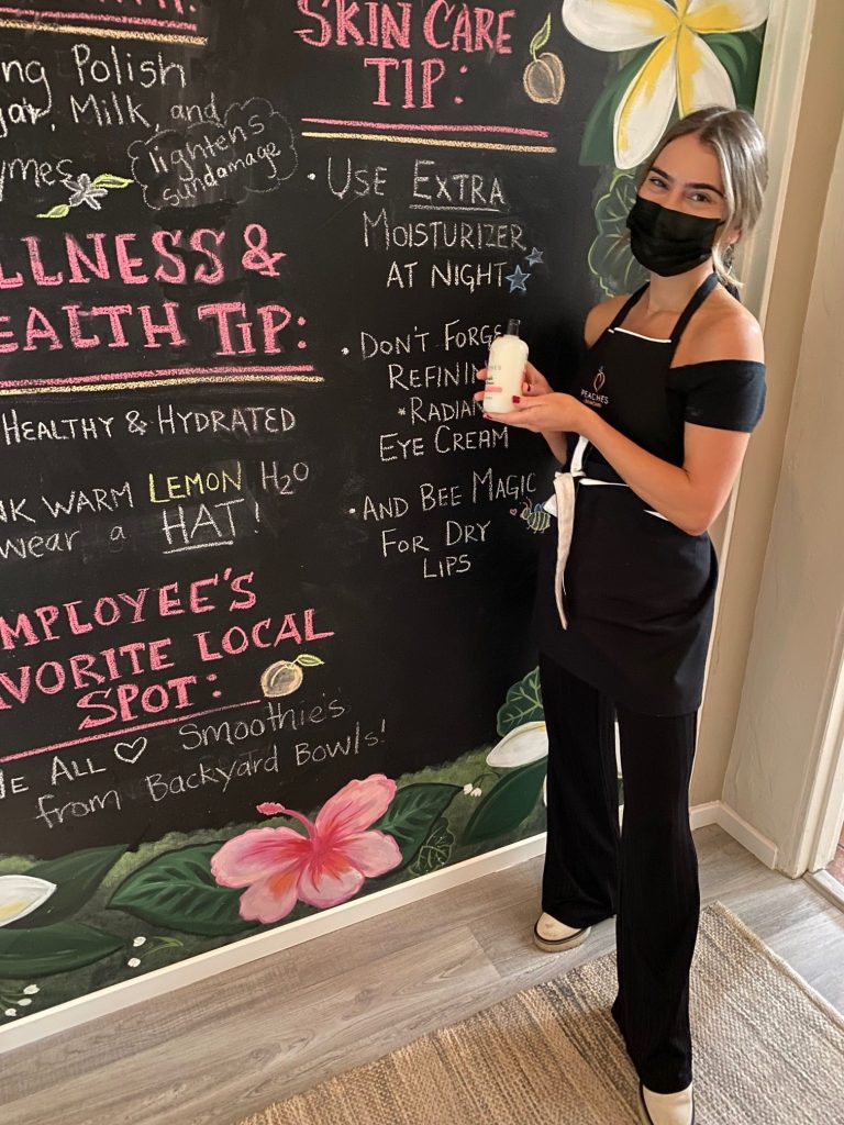 From the fireplace in the waiting area to the colorful chalkboard sign in the hallway, Peaches is warm and welcoming. They offer their own natural, organic, vegan line of skin-care products, and they stand by the unique philosophy that one facial works on all skin types, regardless of age or skin condition. It certainly worked its magic on me.