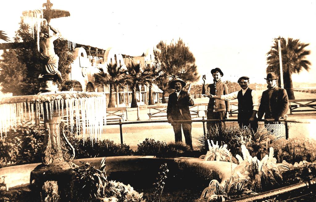 Several of his photos were used for postcards that tourists could purchase here and send to friends back home. Perhaps his most famous — or infamous — photo was of a large fountain in a park near the beach with long icicles dripping from it! He took the photo during an exceptionally cold morning in January 1913. He then produced postcards with the photo.