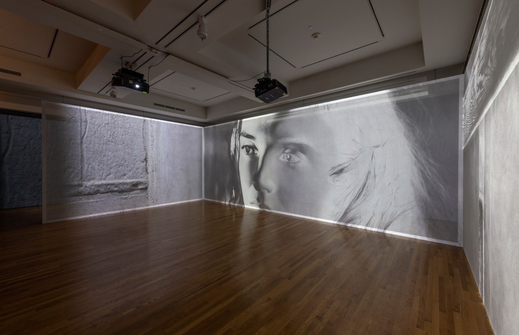 Kuhn, who has built an international reputation around her sensitive and aesthetically nuanced figure photography, began by assembling an intricately layered palimpsest that weaves together images of a female model with drawings, letters, and photographs of the house. Visitors to the exhibition start by examining documents drawn from the AD&A’s collection in a dimly lit antechamber. They then enter a three-sided projection structure where 835 Kings Road unspools on giant screens stretching from the gallery floor to the ceiling. Salchow’s ambient surround-sound score accompanies the mesmerizing montage that ensues.
