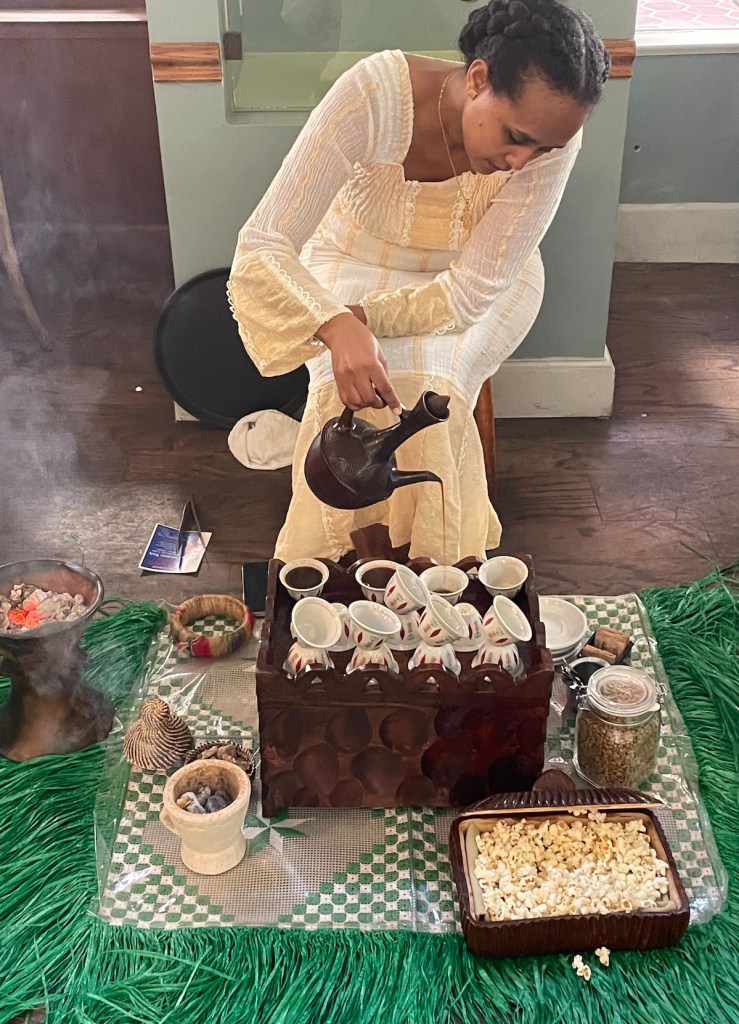 “The idea is to awaken your five senses,” said Alemu, who said the coffee is not as thick as Turkish and not as bitter as Cuban. “Ethiopians focus more on the aroma and the taste, getting that chocolate-y oil out of the coffee bean.”