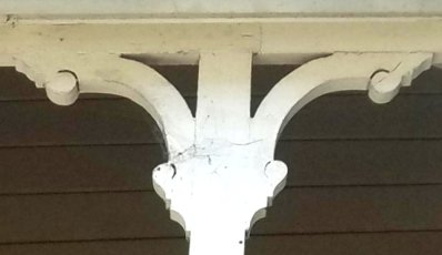 The overall simplicity of this Victorian home is highlighted by the flowing curves of the spandrels that ornament the top of the porch posts. These are flat pieces of wood that were cut with a scroll saw. A scroll saw has a narrow-toothed blade that moves up and down as the operator guides the wood past the blade. Early scroll saws were foot-powered, and later ones were powered by machine.