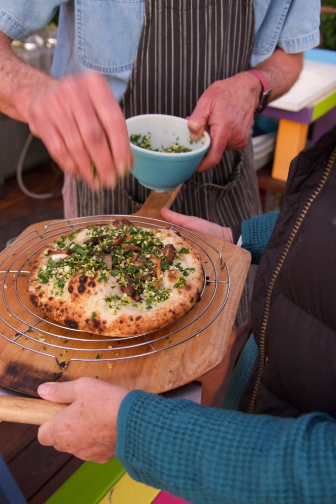 After these impressive starters, the pizza oven was ready to go. John began with a farinata, which is basically a large chickpea pancake topped with olive oil and herbs. (The chickpea flour was milled at home, of course.) Then he made four pizzas— marinara, mushroom, sausage, and fig.