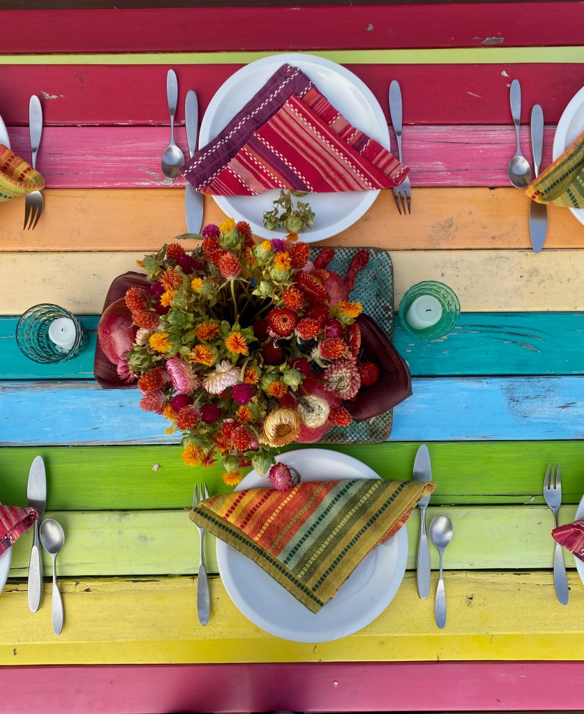 On a recent evening at the Seigel-Boettners’, neighbors brought their own homegrown dishes to complement John’s pizzas. Sisters Ellen Stoddard and Andi Varon, as well as Gregore and his wife, Jennifer Rabe-Morin, walked over and were greeted by the rainbow picnic table lit with votives, and a centerpiece of crimson pomegranates and peppers from the garden.
