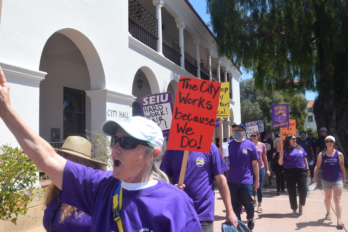 After hosting a spirited rally outside City Hall on Tuesday, Santa Barbara city workers wearing purple T-shirts bearing the insignia of Service Employees International Union Local 620 thronged the council chambers for the grand opening of the Santa Barbara City Council budget deliberations. One after the next, city workers termed the administration’s offer of a 3 percent raise — over two years — “a slap in the face” and demanded respect for keeping the streets cleaned, the spigots flowing, and the wastewater system functioning. To the extent Santa Barbara remains a special place, they stated, their sacrifice was the reason why.
