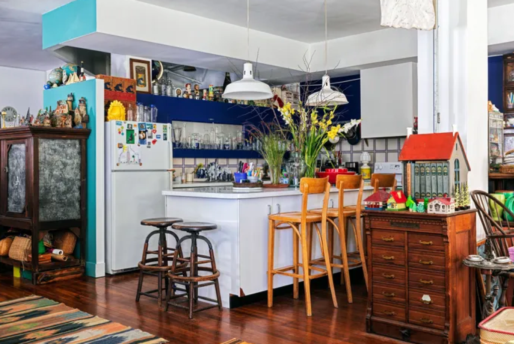 If the kitchen shown above makes you nervous, with its maximalist style, unmatching seating, and tchotchkes galore, have no fear. This article from Curbed introduces Dorothy and Stephen Globus: married for 49 years and with diametrically opposed style sensibilities. Dorothy is a collector. As she says, “Marie Kondo says ‘Throw out anything you don’t love.’ Well, I love it all, Marie! What am I going to do?” After extensive travel in Japan in the ’90s, Stephen decided to pare down to a more minimalist lifestyle. In order to compatibly coexist, the couple turned their seventh-story New York City loft into a his-and-hers side-by-side living space that works for them. Stephen has a teahouse — complete with tatami mats, shoji screens, and a bamboo ceiling. Dorothy — a curator at museums, including the Smithsonian, throughout her career — has plenty of space for her collections, which include everything from globes to rubber stamps to hose nozzles. I love this story of making your space work — and keeping your partner happy — no matter your sense(s) of style.