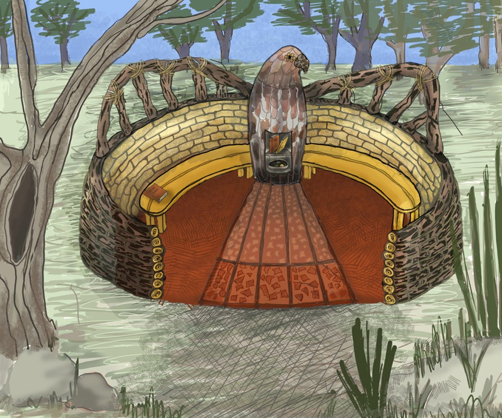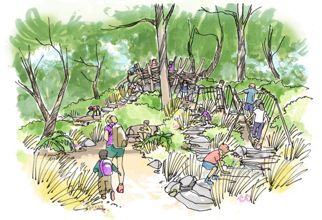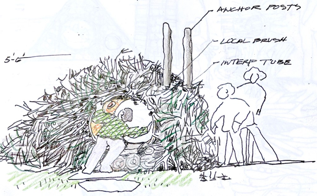 A large wooden hawk spreads its wooden “wings” to create a semicircular seating area. Inside the hawk is a “little library” with nature-themed children’s books and a bowl for “offerings” of natural items (like leaves or small rocks). Nearby is an area for kids to build their own stick nests. This immersive structure will be located just above the lower creek crossing. “The exhibit honors our special connection to nature through a representation of a bird that can be regularly seen soaring about our heads in Santa Barbara,” says Westheimer.