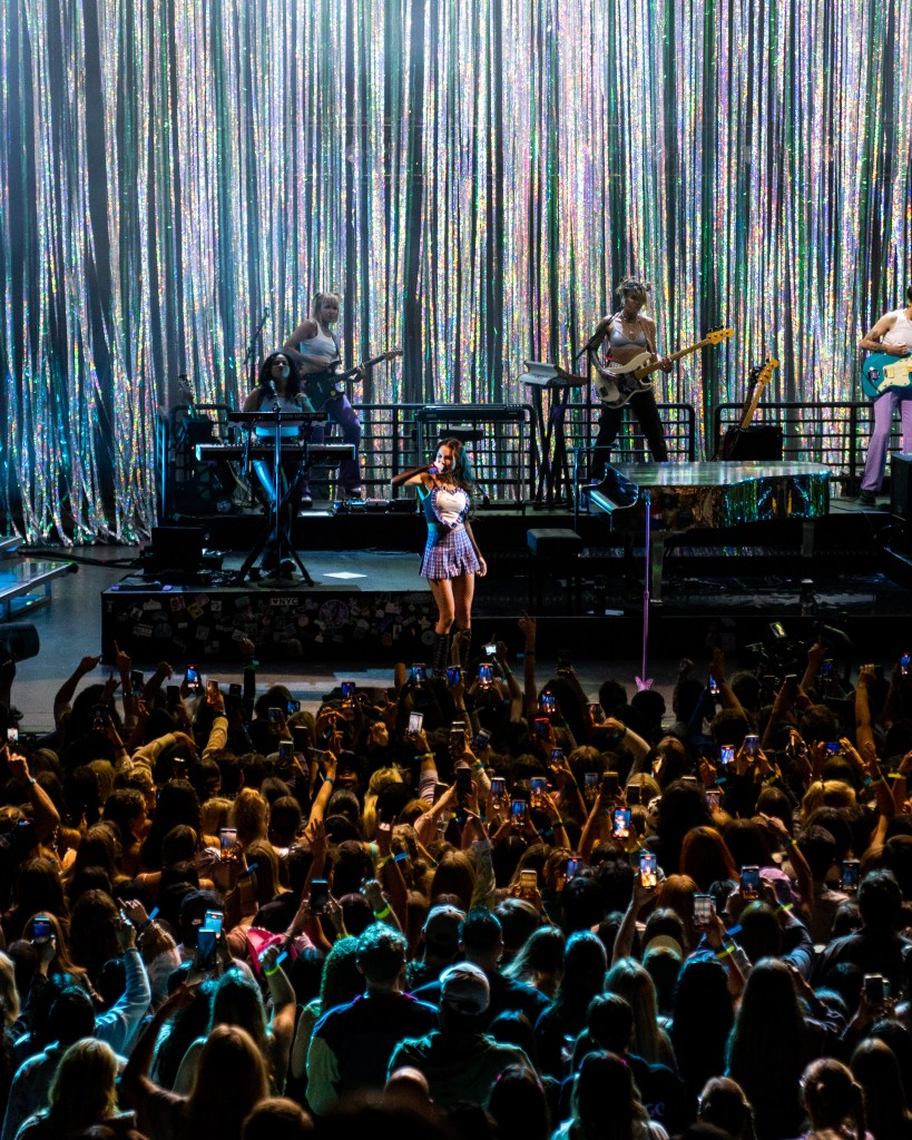 An ocean of smartphone flashlights waved in the air to “hope ur ok,” the sparse ode to old friends, that was rounded out by the band backing into a more propulsive, country-leaning track – until the curtains closed behind Rodrigo to isolate the sound of her voice and acoustic guitar on the outro. The bedroom popsmith got even closer to the pit during her self-penned High School Musical track, “All I Want,” as she sat at the edge of the stage for the first half.