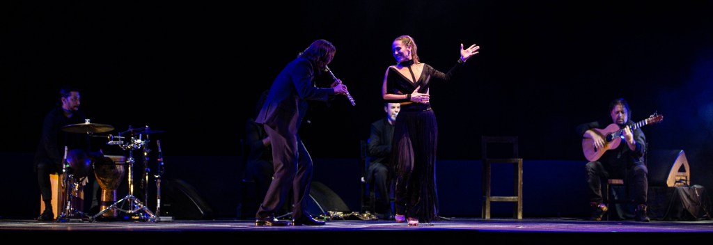 Musical Director, Composer, and Spanish Guitarist José Luis de la Paz — another extraordinarily charismatic presence — had a solo rondeña that garnered enthusiastic rounds of olé from the audience. And singers Rafael de Utrera and Manuel Gago, as well as Diego Álvarez on percussion, kept the music in fine form for the evening. Garrido’s saucy guajira added some Cuban spice to the mix, followed by Alegrías featuring the entire company of dancers in shimmering black fringe, creating snappy shapes with chairs as props, which brought Bob Fosse’s All That Jazz to mind.