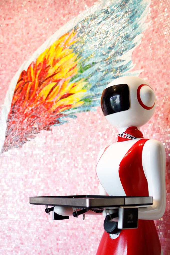 When I finally investigated, it looked not high-tech enough, but pleasant. I ordered from a very kind and friendly human, and just about the time the appetizers should arrive, I heard a rumbling coming toward me. Yikes. A stylized female automaton bore the steamed dumplings, and in a very loud voice — frightening the clearly stoned kids at the next table into nervous laughter — she told us to take the food from her tray and touch her hand so she could get back to work. We grabbed the dumplings, and the robot (named Shadu, by the way) retreated.