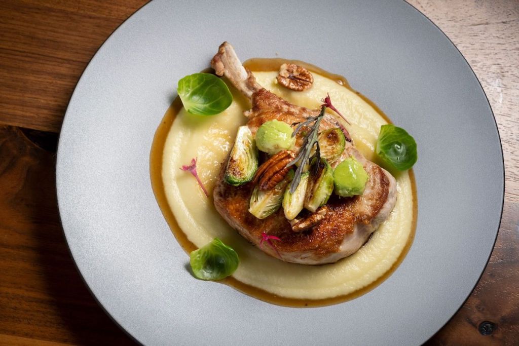 The sunny atmosphere certainly matches much of Riker’s cuisine, particularly the many salads and fresh seafood apps and entrees. (“This is the best poke I’ve ever had, and that includes Hawai‘i,” was my wife’s endorsement.) But there’s plenty of heavier options on the menu too, including my pork chop, a short rib pappardelle, buttermilk fried chicken, and a New York strip.