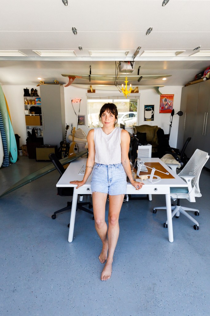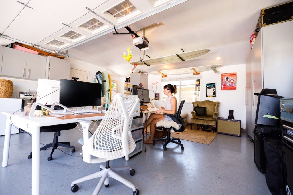 Prioritizing the work-life balance is still key, she says. Her boyfriend was with her in Mexico, but now he’s at UC Santa Cruz finishing up his studies, and a flexible job allows her to visit him for weeks at a time. Her workspace reflects this balance as well: She and her housemates have set up a creative coworking space/band practice spot/surfboard storage unit — all within the confines of their garage.