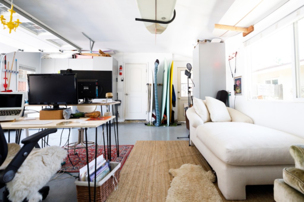 Prioritizing the work-life balance is still key, she says. Her boyfriend was with her in Mexico, but now he’s at UC Santa Cruz finishing up his studies, and a flexible job allows her to visit him for weeks at a time. Her workspace reflects this balance as well: She and her housemates have set up a creative coworking space/band practice spot/surfboard storage unit — all within the confines of their garage.
