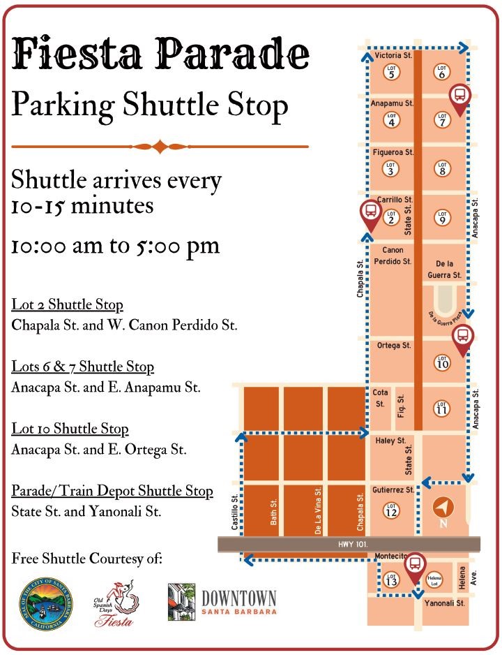 Santa Barbara Trolley pondrá a disposición tres carros al aire libre. Los carros de transporte recogerán a las personas en el Garaje Canon Perdido (Lote 2), el Garaje Granada yel Garaje de la Biblioteca (Lotes 6 y 7), y el Garaje Ortega (Lote 10) y llegarán a la calle State y a la calle Yanonali, cerca de la estacion de trenes, que está a una cuadra de la ruta del desfile. Los servicios de transporte gratruitos circularán por la calle Chapala, cruzarán la calle Victoria, y bajaran por la calle Anacapa hasta el lado de la playa de la calle State desde las 10 a.m. hasta las 5 p.m. en intervalos de 10 a 15 minutos (consulte el gráfico para las ubicaciones de el transporte).