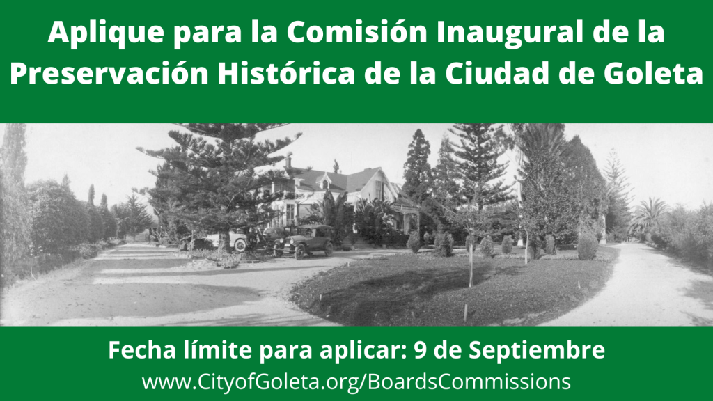 Don’t miss this historic opportunity! Apply for the City’s first Historic Preservation Commission at http://www.CityofGoleta.org/BoardsCommissions. Applications due by September 9, 2022, at 5:00 p.m. For questions contact cityclerkgroup@cityofgoleta.org.