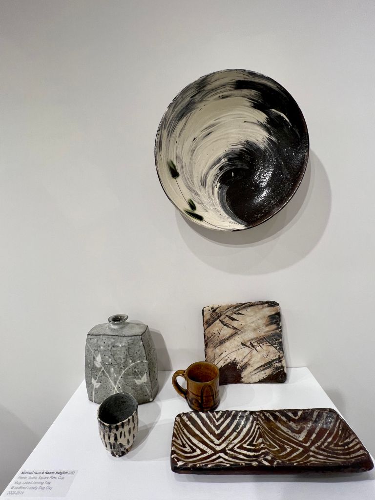 His fondness for the functional is abundantly clear in his collection. Rows of colorfully hand-painted mugs stand, displaying eclectic patterns and round, smug-looking faces. Large dinner plates with sweeping brush strokes hang solemnly on the wall. Various vases and plates line the shelves, speckled with grooves and painted lines. Be sure to swing by to view this spectacularly diverse collection.