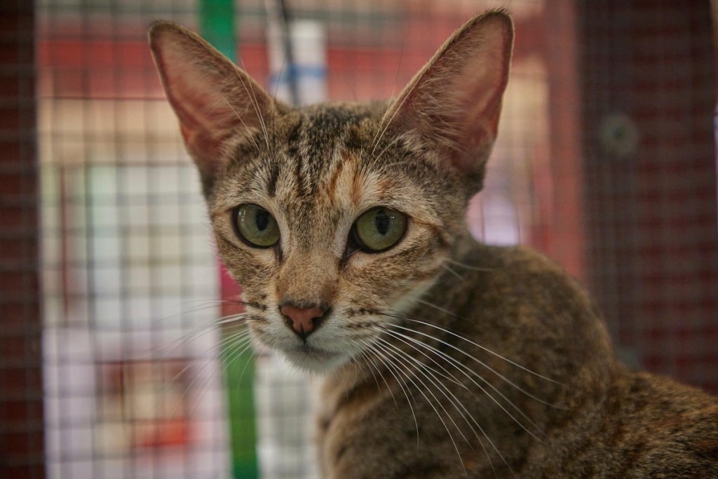 She looks like an Egyptian Sphinx cat with her narrow face, magnificent large eyes, slender body and spots. I suspect there is some Bengal somewhere in her DNA. I can just imagine her sitting outside of King Tut’s tomb guarding it … that is the regal look she has.