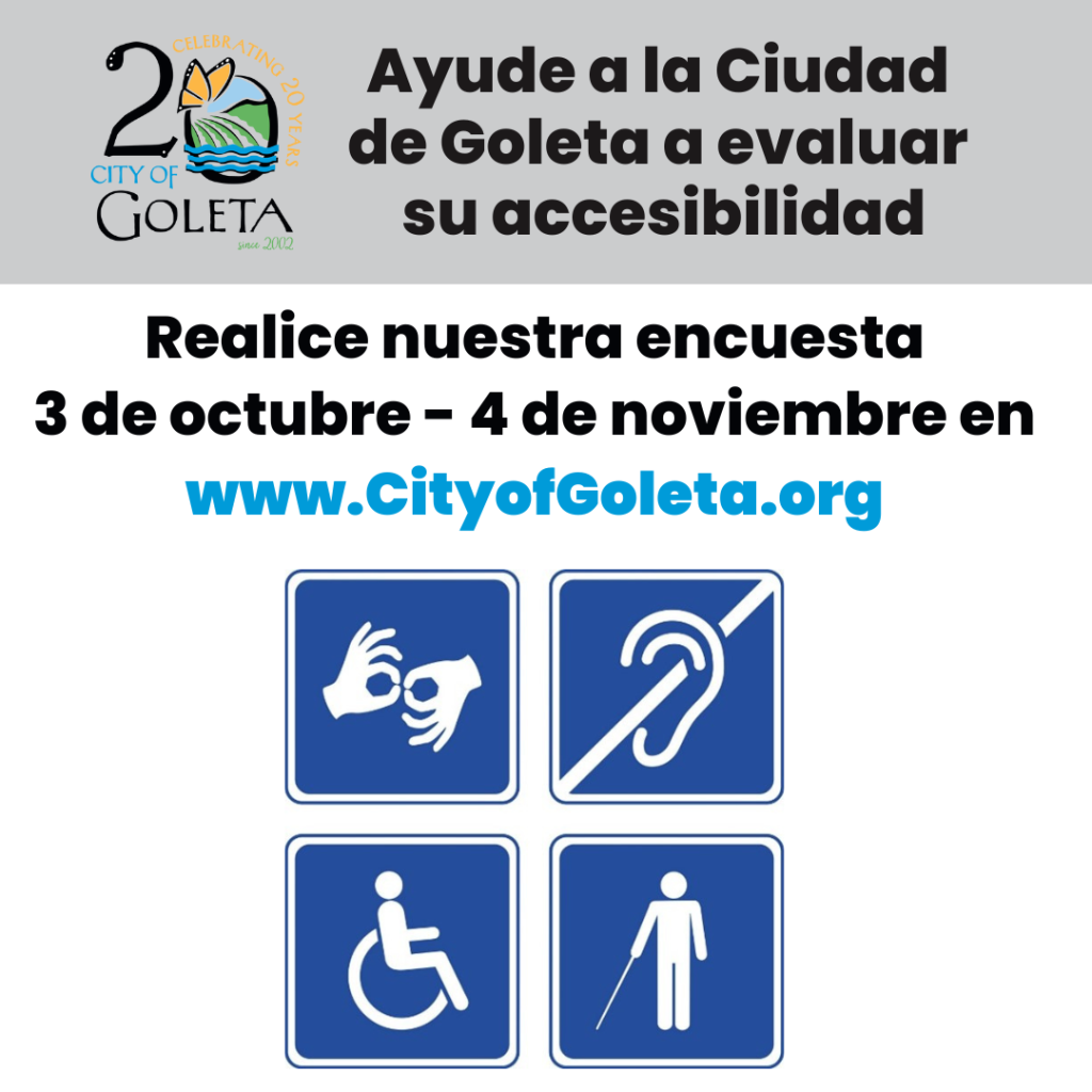 GOLETA, CA, 3 de octubre, 2022 – Como parte de los esfuerzos para servir a todos los miembros de la comunidad, Ciudad de Goleta está en proceso de actualizar su Plan de Autoevaluación y Transición de la Ley de Estadounidenses con Discapacidades (ADA). El plan de accesibilidad de la Ciudad proporciona un plan integral para que las personas con discapacidad accedan a las instalaciones, programas, servicios, actividades y eventos de la Ciudad que se ofrecen al público.